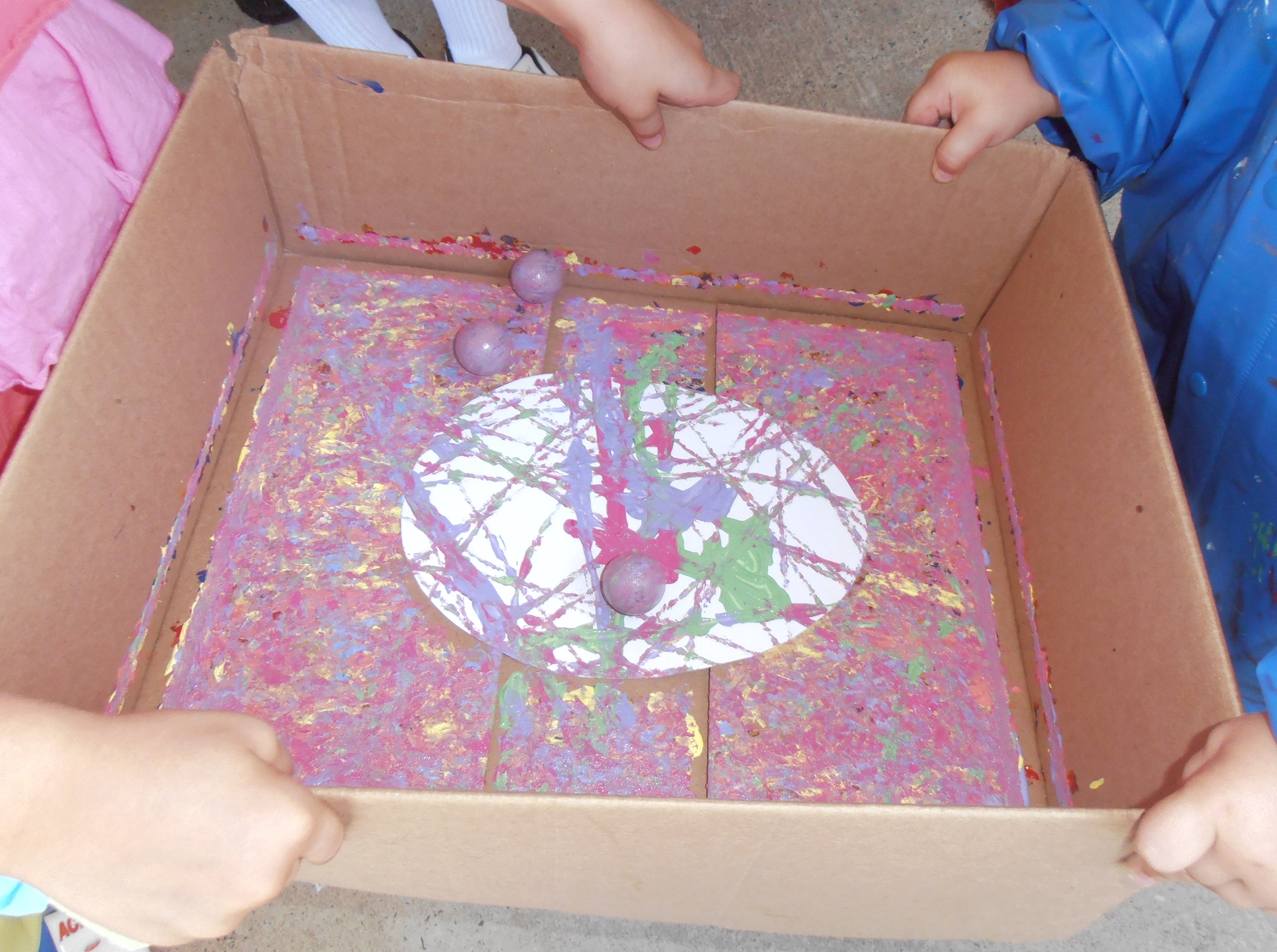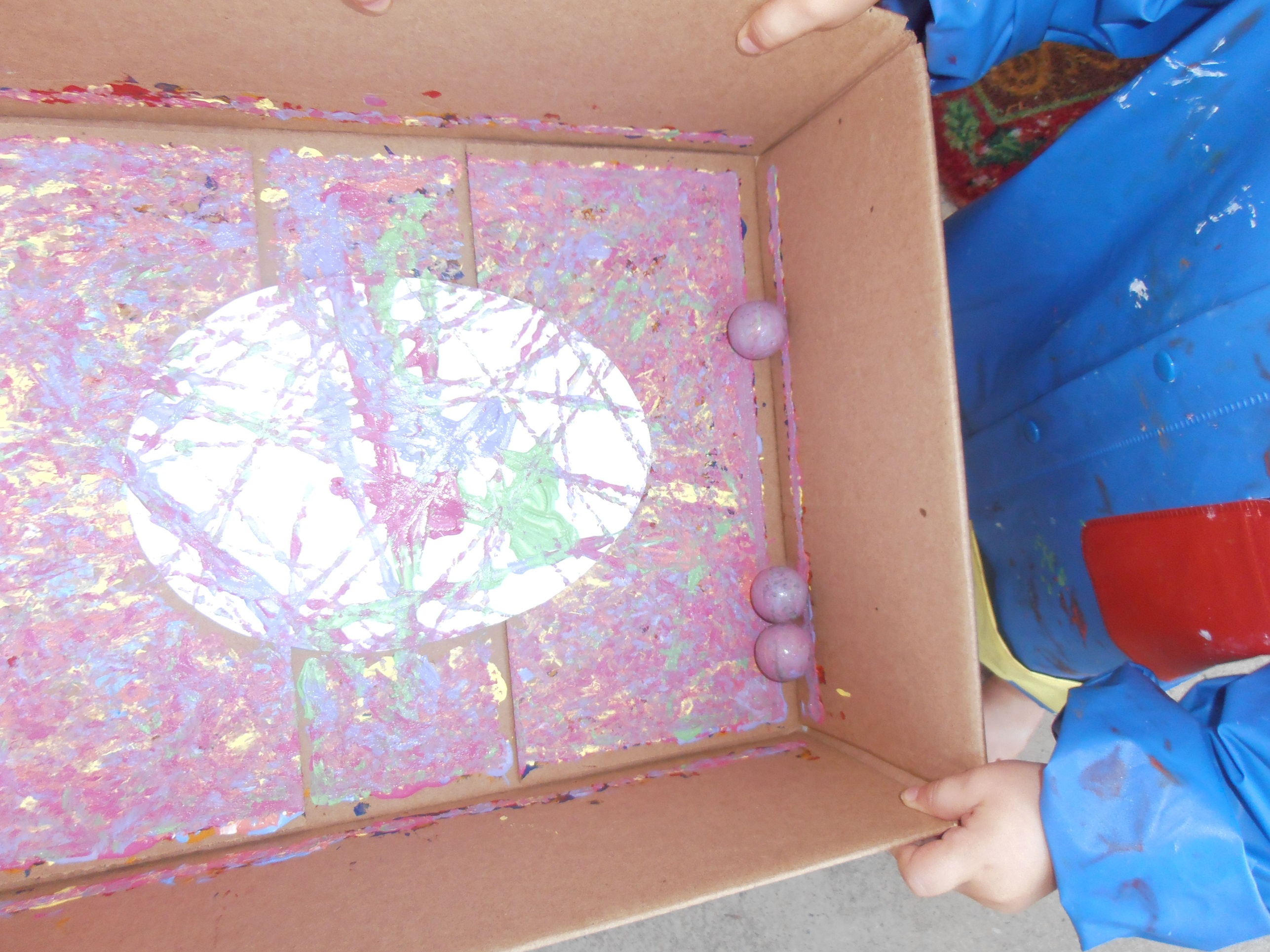 Step Four – This is the best part! Get the child/children to hold each end of the box and tip it back and forwards, side to side, making the paint covered marble roll all over the Easter Egg.