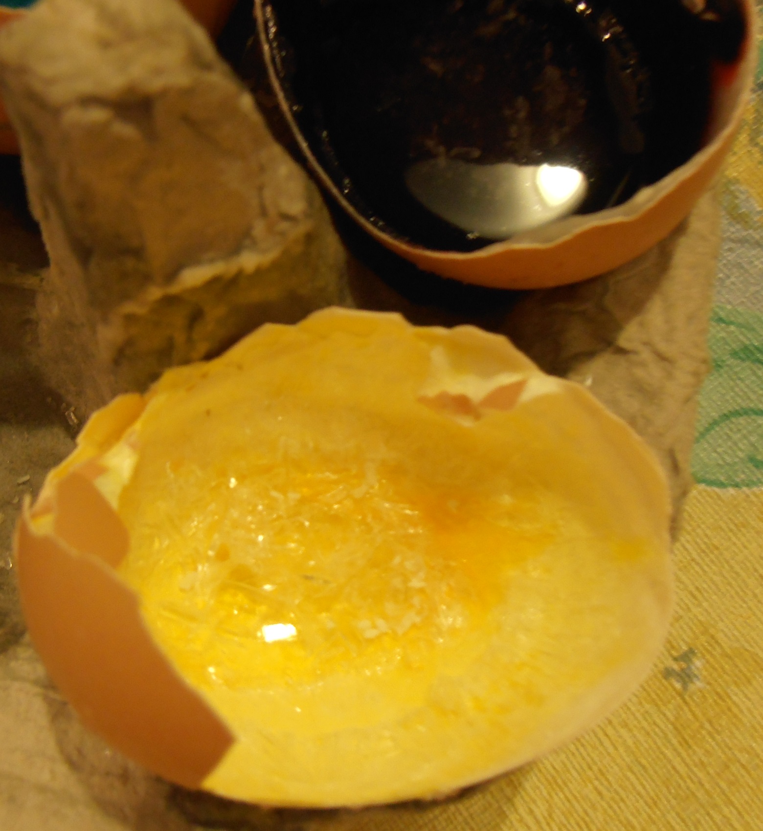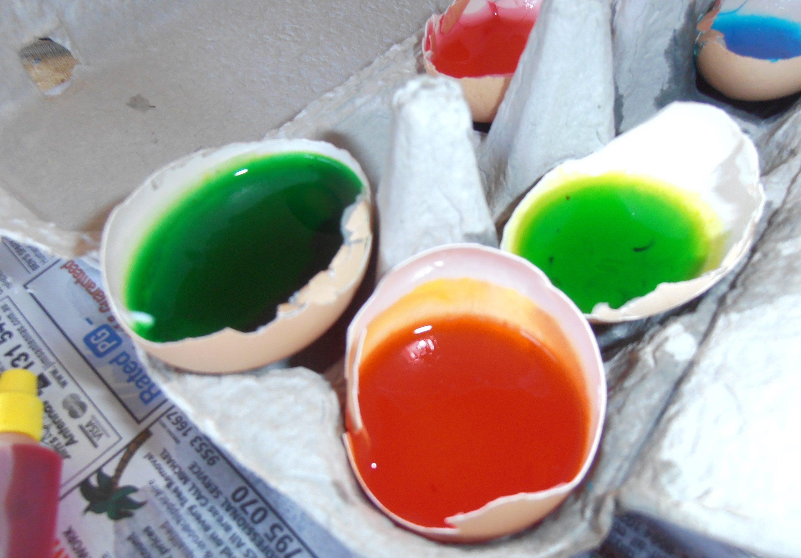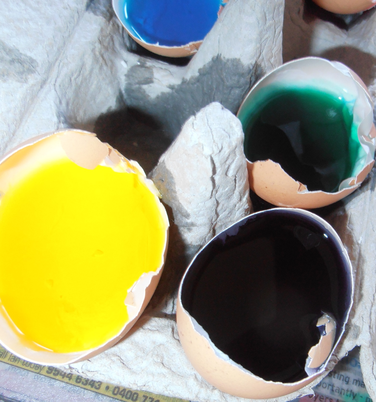 Step 4 – Add a different drop of food colouring to each egg shell and give each a stir.