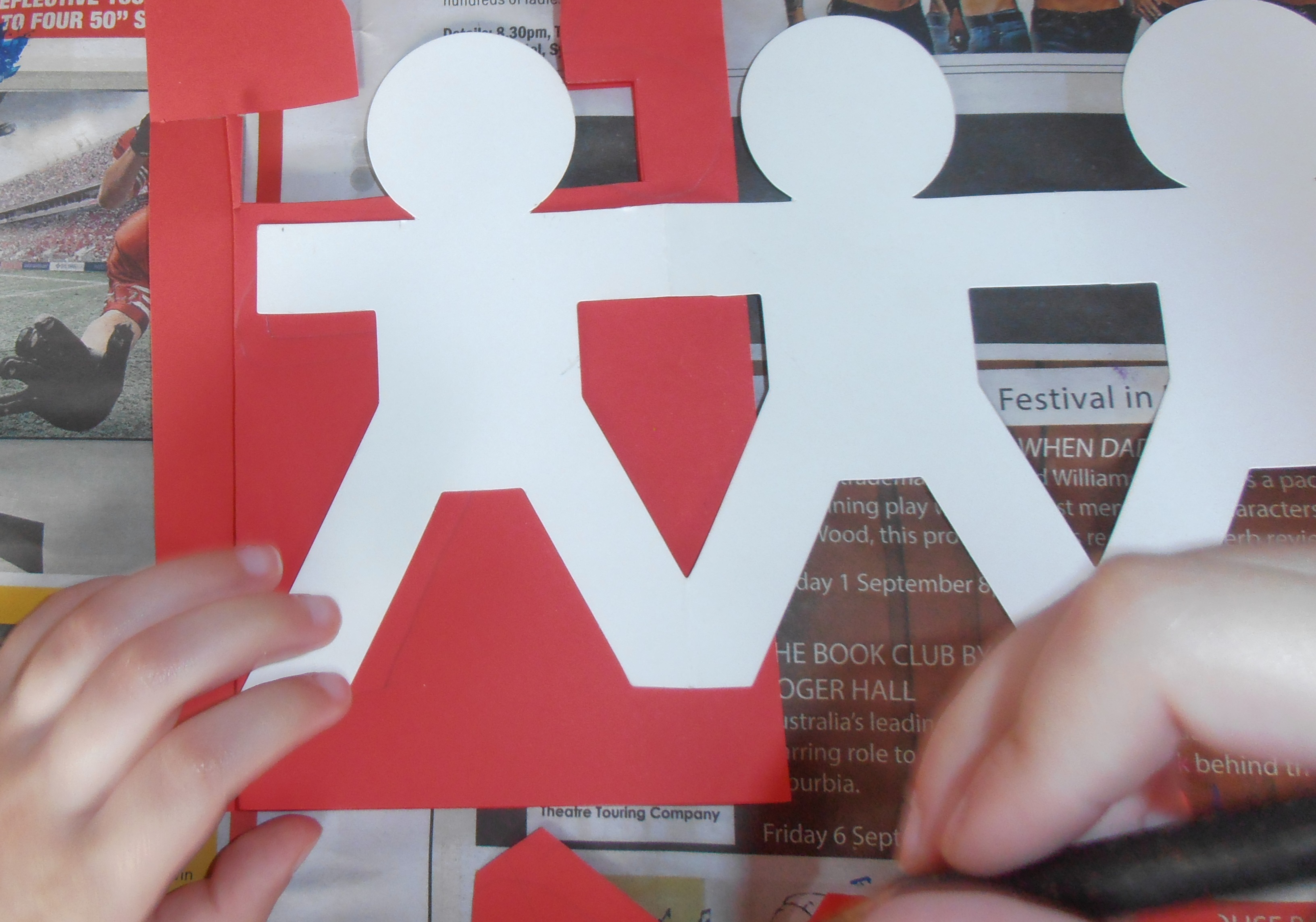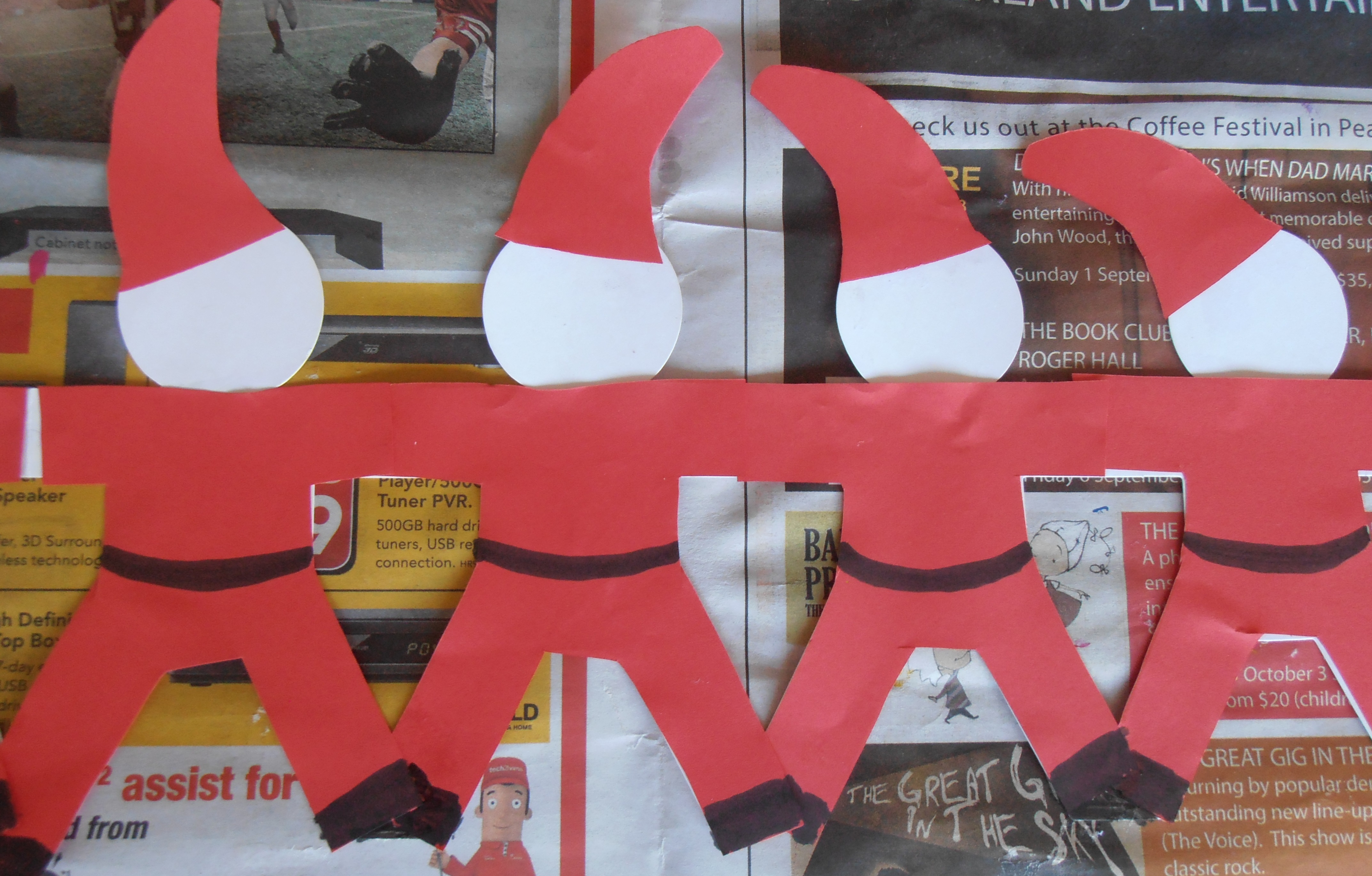 Step 1 – Fold paper into threes in a concertina pattern. Then carefully trace around the shape of your cardboard person onto the red paper. This will make enough outfits for three Santas so repeat the process to make enough outfits for all six Santas if you are using six. Cut each outfit out.