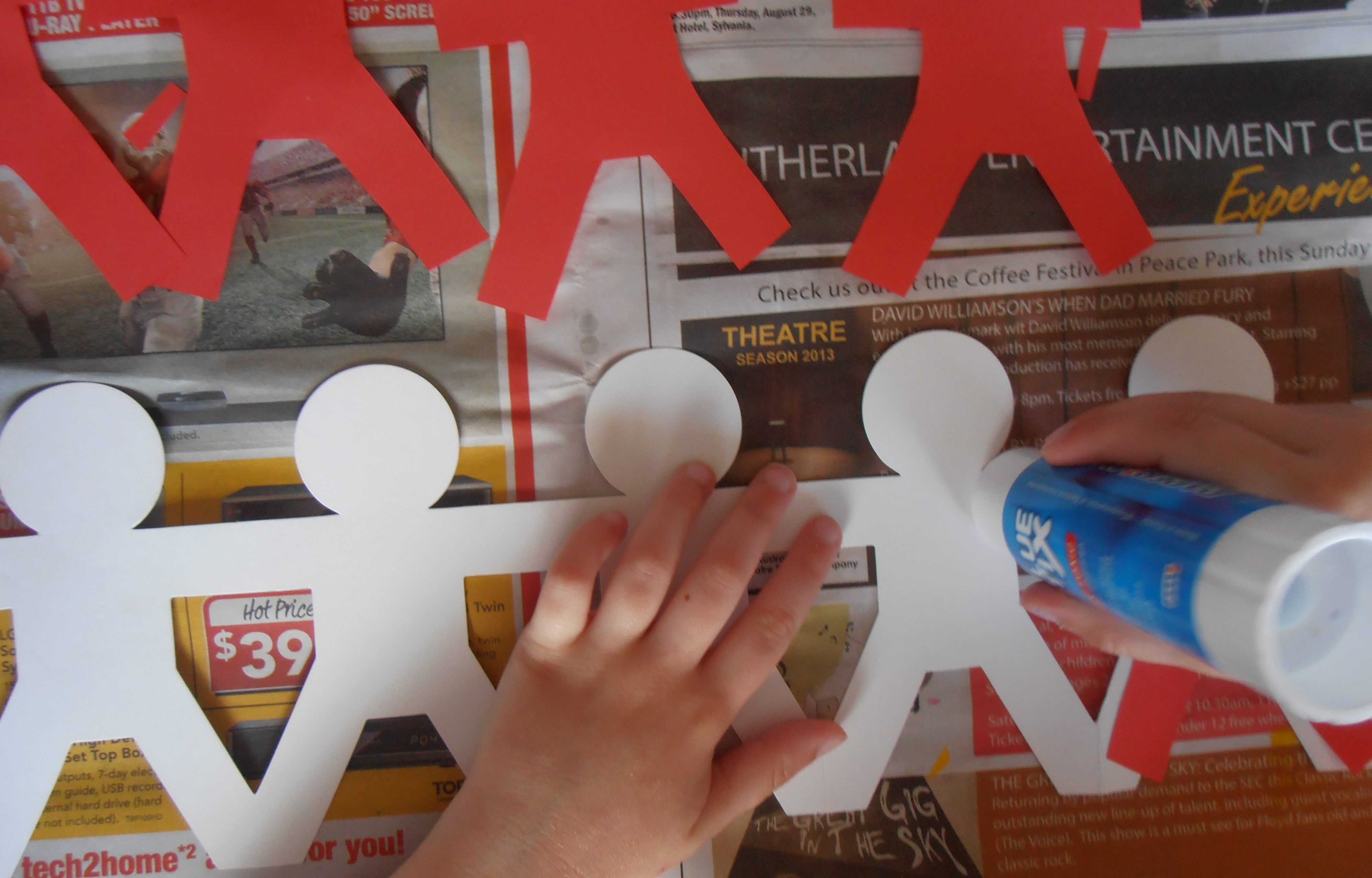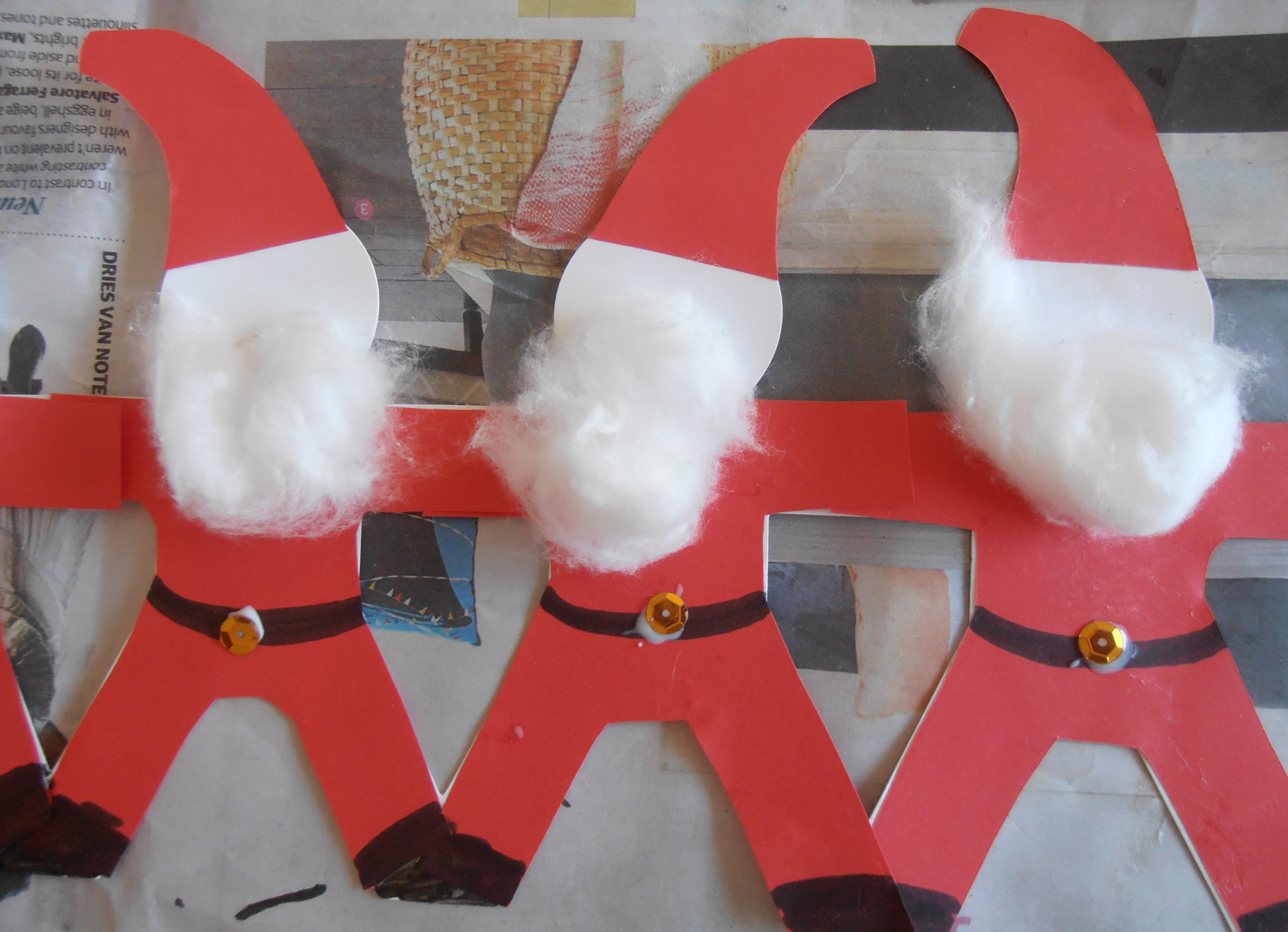 What you will need – cardboard people or cardboard to cut your own people, red paper, cotton wool, black marker, googly eyes, tiny white pom poms, gold sequins, PVA glue and Glue stick.