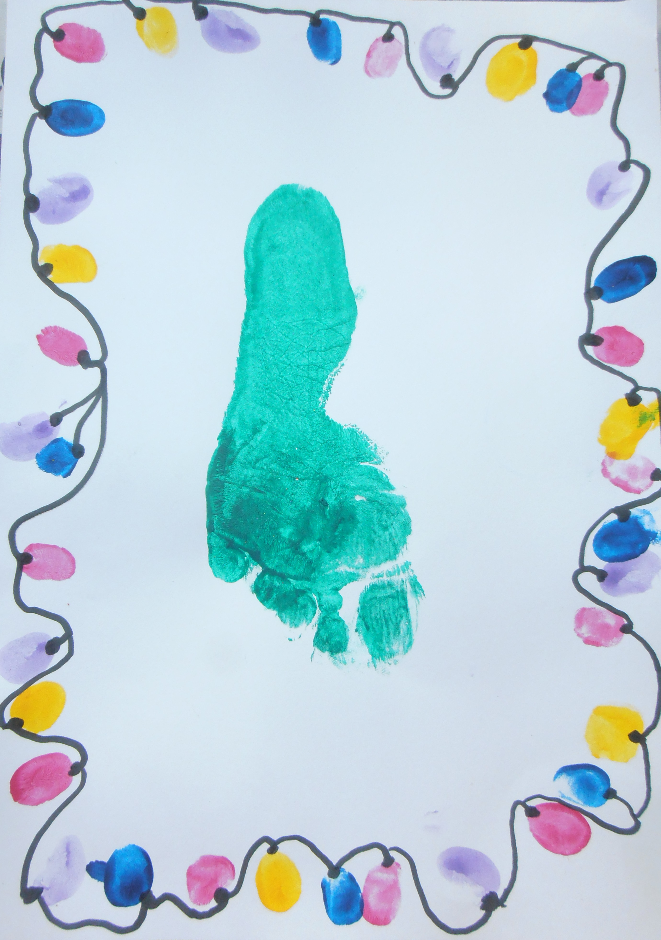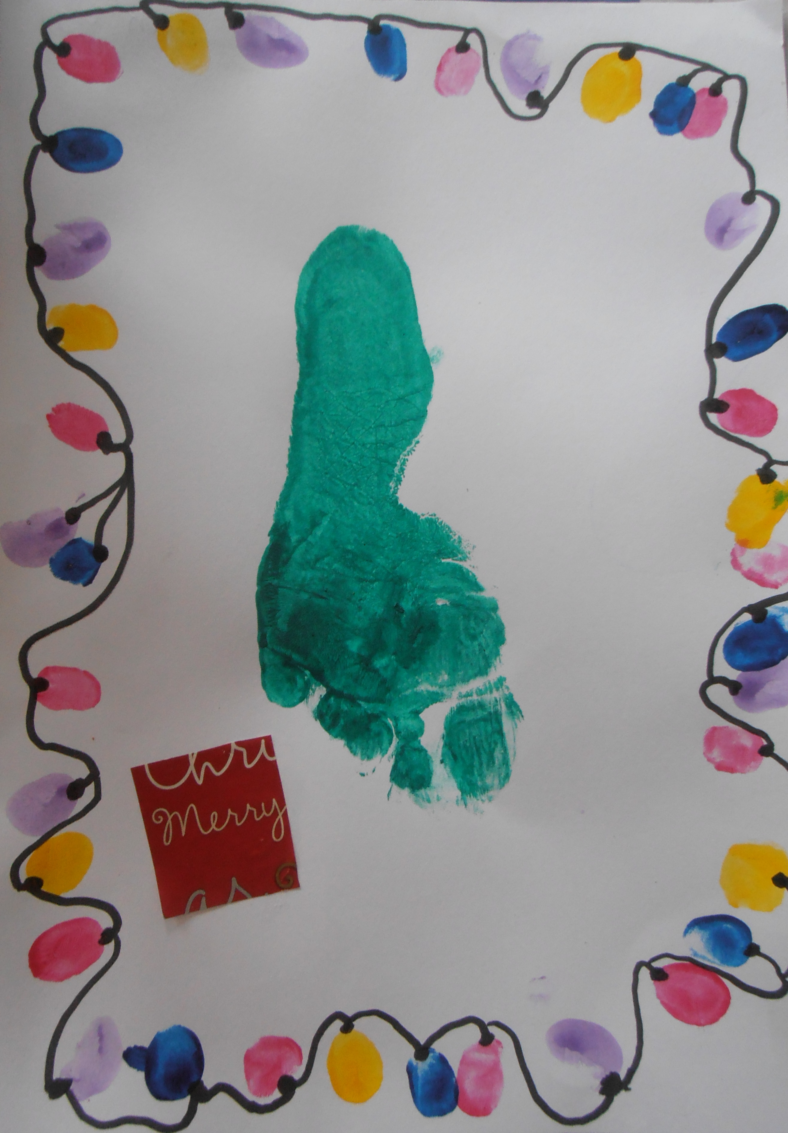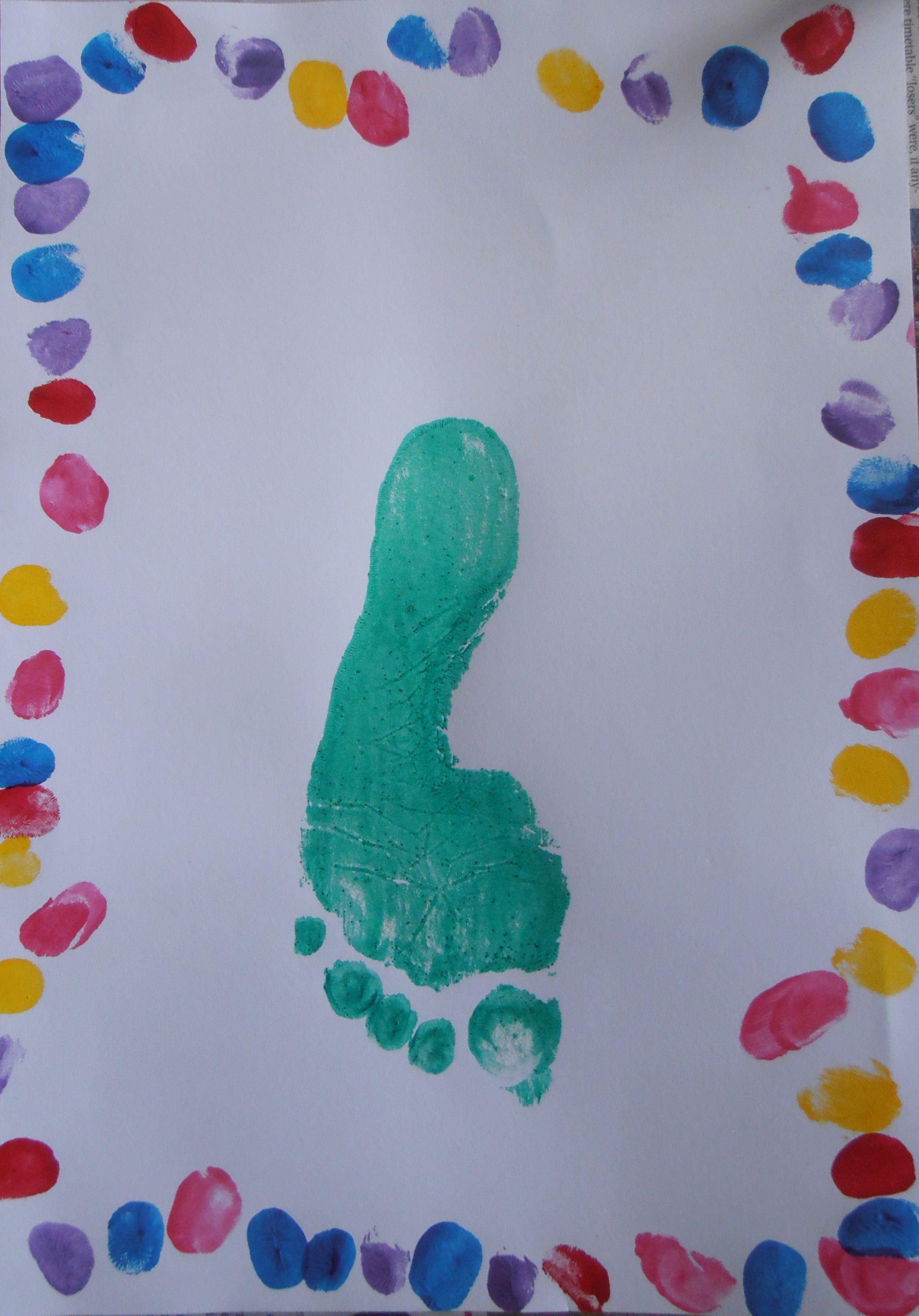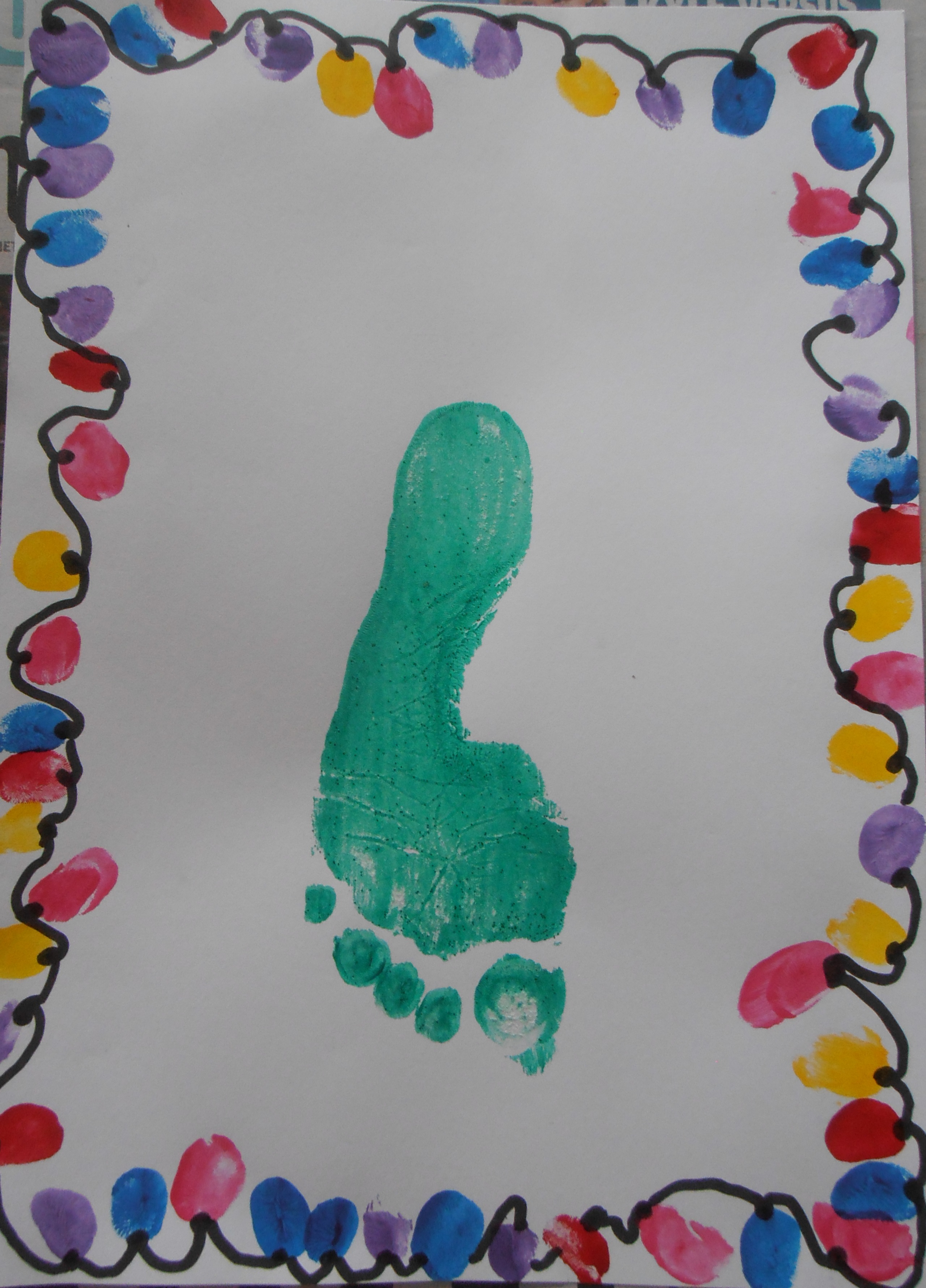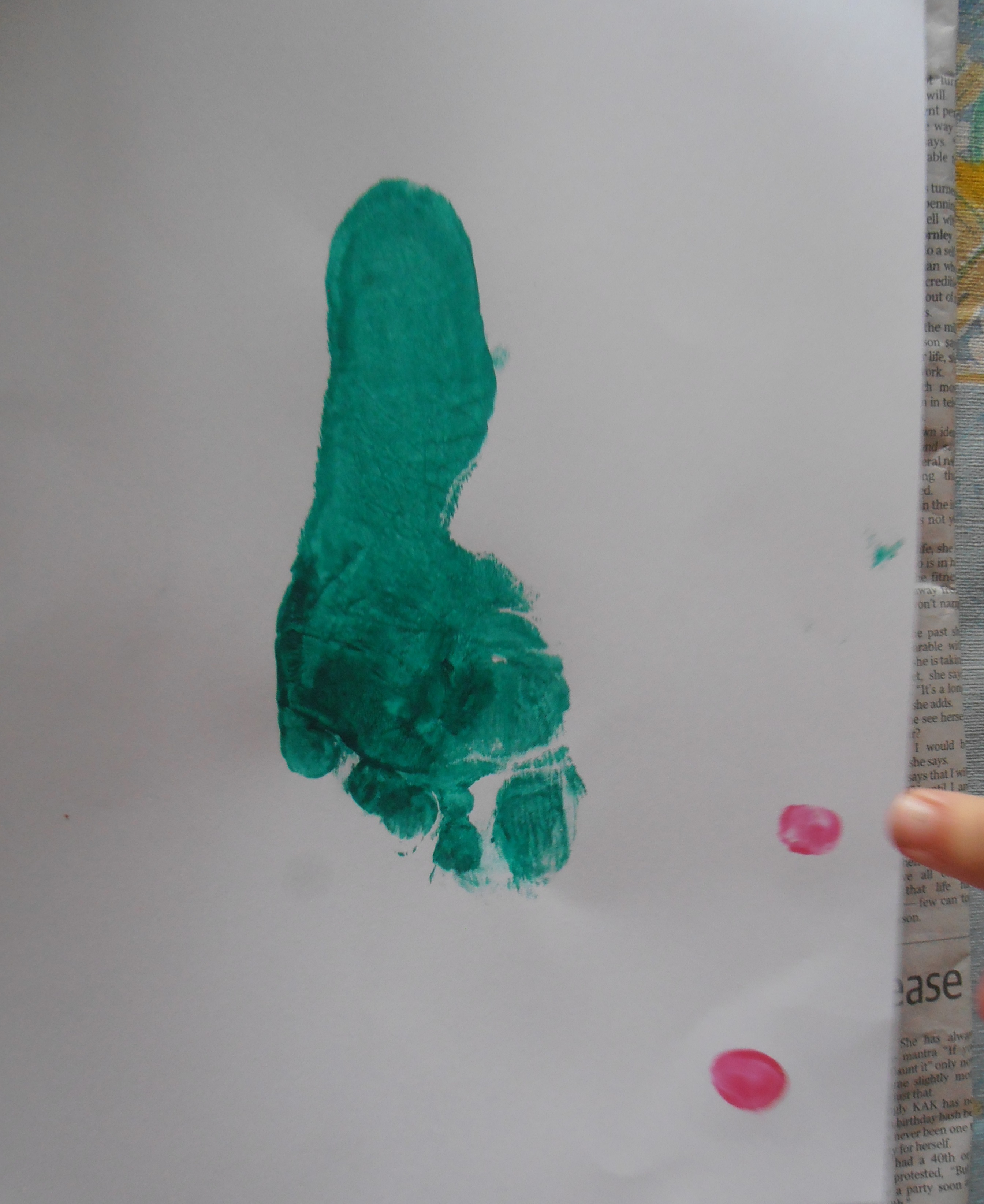 Step 1 – Paint the child’s foot with green paint and then get them to stamp it in the centre of the white A4 cardboard.